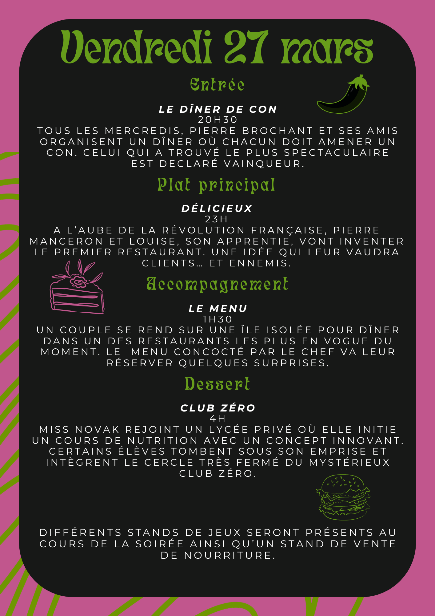 La dernière soirée proposera plusieurs projections et animations (blind test, dégustations, quiz cinéma), notamment la projection du film Le Dîner de Cons, ainsi que différentes activités festives et la remise de prix.