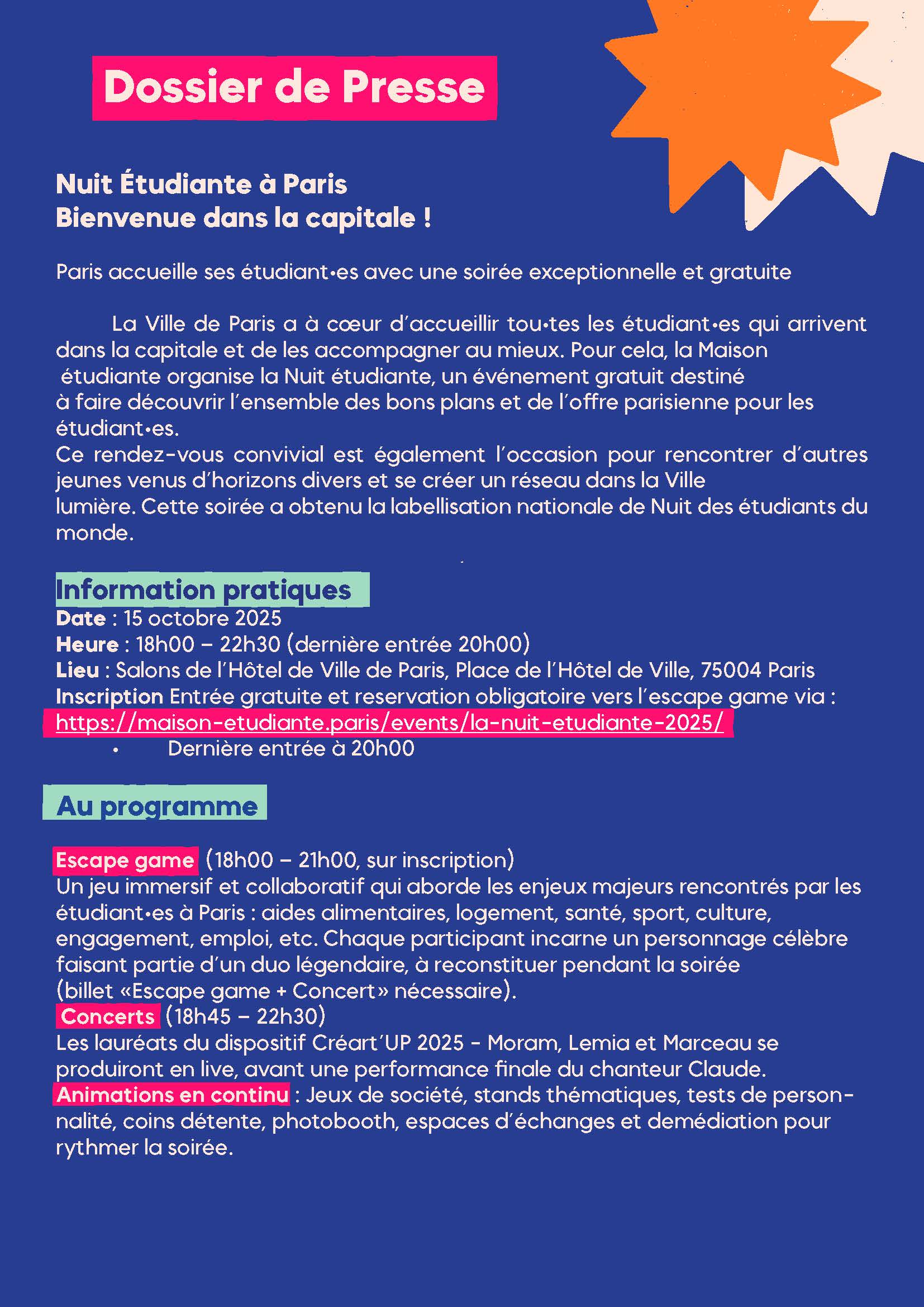 La Ville de Paris accueille et accompagne au mieux les étudiant·es qui font leur rentrée dans la capitale. C’est dans ce cadre que la Maison étudiante organise, le 15 octobre 2025, la Nuit étudiante, un rendez-vous festif et informatif qui présente toutes les ressources et bons plans disponibles pour les étudiant·es à Paris.