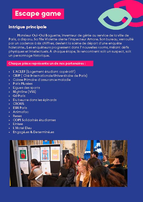 - Un escape game immersif et collaboratif, autour des grands enjeux de la vie étudiante : logement, santé, aides alimentaires, sport, culture, engagement, emploi, etc.