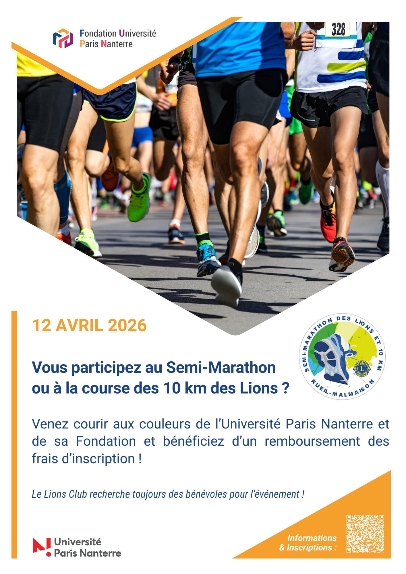 Dans le cadre du semi-marathon et de la course des 10 km organisés par le Lions Club de Rueil-Malmaison (12 avril), la Fondation Université Paris Nanterre cherche les étudiants déjà inscrits afin qu'ils courent aux couleurs de l'université et de sa fondation.