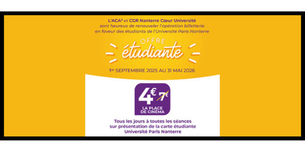 Réservations directement aux caisses du cinéma (offre valable sur présentation de la carte étudiante de l’Université Paris Nanterre 2025-2026).