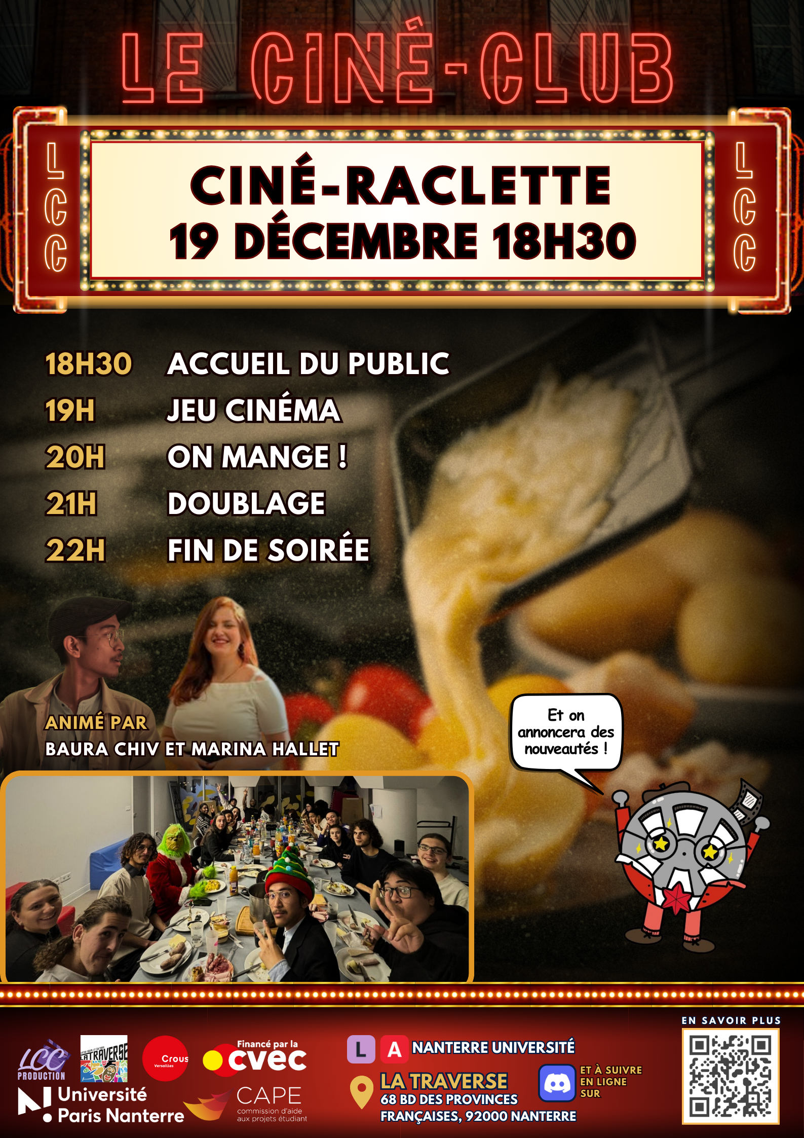 Les étudiants de l'antenne de l'association LCC Production proposent 8 séances de Ciné-Club en présentiel à La Traverse. Parmi ces séances, 6 seront dédiées à la projection de long-métrages suivies d'un échange/débat animé par les membres de l’association, une autre sera dédiée à célébrer la période de fin décembre (fin du semestre 1, fin de l'année, fêtes qui approche...) afin de renforcer la cohésion des membres et adhérents, et la dernière sera dédiée à célébrer la fin de la saison avec une remise de prix et un compte rendu collectif de cette saison, sous forme d'AG de fin d'année.