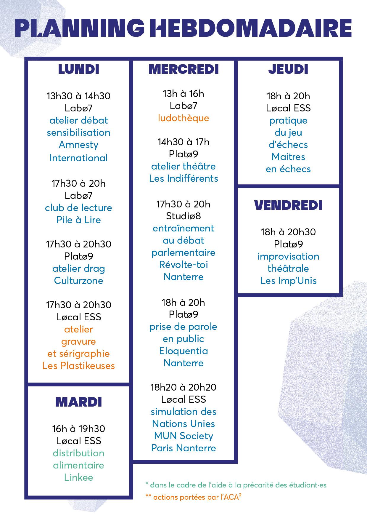 Et découvrez ci après l'offre d'ateliers et de rendez-vous récurrents qui sont proposés à la Maison De l'Etudiant·e par les associations pour le premier semestre de l'année 2025-2026 :